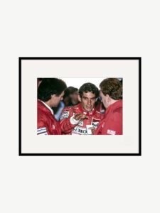 This print will appeal as much to collectors of Ayrton Senna memorabilia as to fans of sports photography. Bruno des Gayets' series from the 1991 season highlights the behind-the-scenes aspects of Formula 1, focusing on moments of concentration and exchange off the track. A photograph designed to form part of a collection of automotive art or to provide a focal point in a dedicated room.